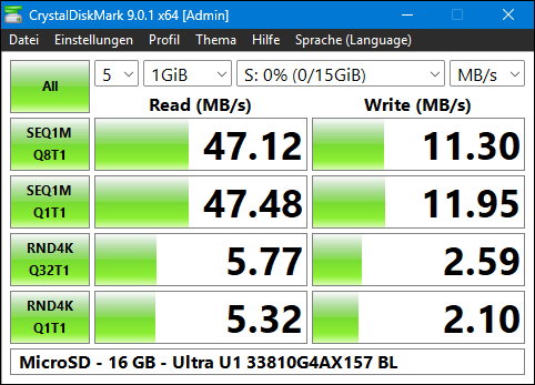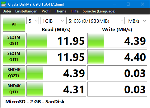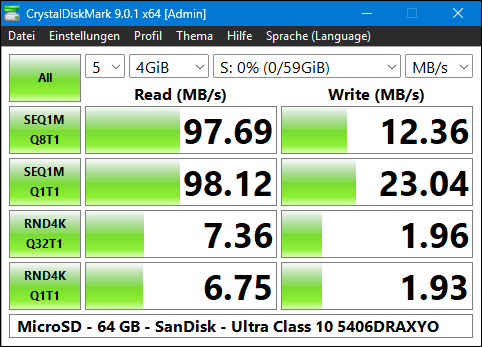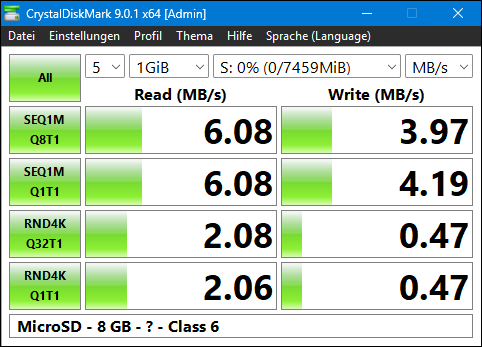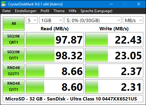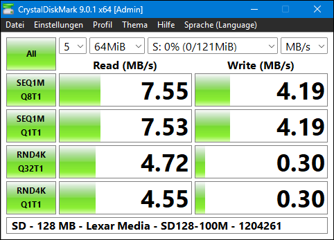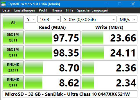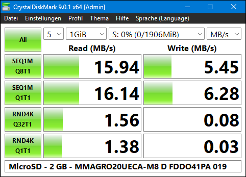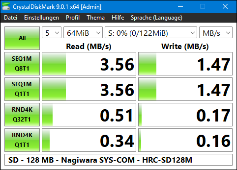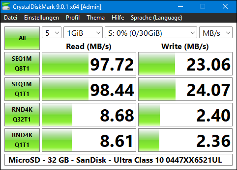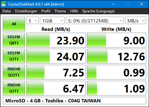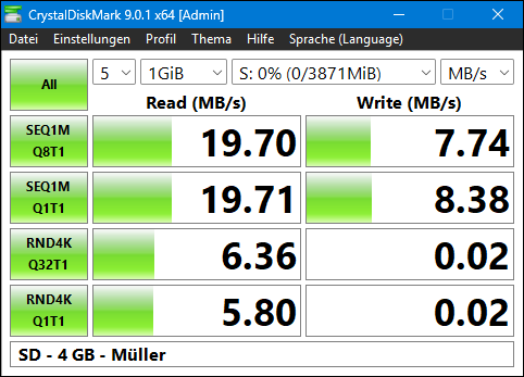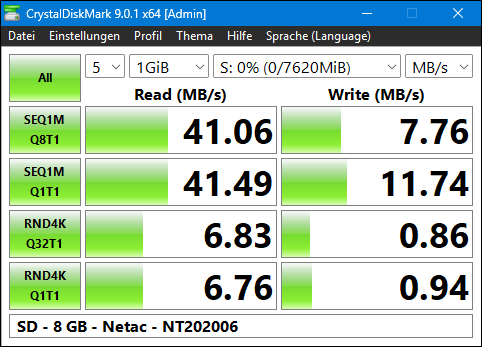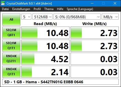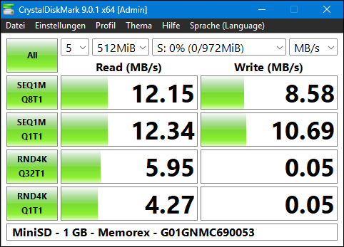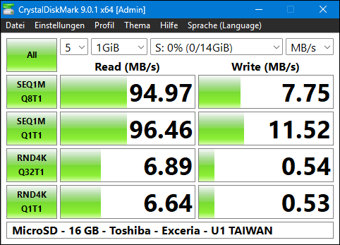 Einfach nur zu Referenz- und Vergleichszwecken versuche ich alle Secure Digital Speicherkarten (SD / SDHC / SDXC, auch Mini und Micro), die mir durch die Hände kommen via CrystalDiskMark v9.0.1 (64-Bit) mit Standardeinstellungen zu testen und die Ergebnisse samt Modelldaten o.ä. hier zu sammeln.