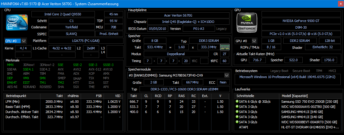 | Prozessor | Intel Core 2 Quad Q9550 (SLAWQ) Penryn → Yorkfield (45 nm) Stepping C1 4 Kerne, 4 Threads Grundtakt 2.83 GHz Caches: L1 : 256 KB L2: 12 MB 95 Watt TDP |