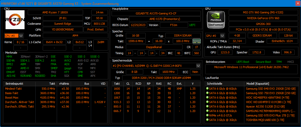 | Prozessor | AMD Ryzen 7 1800X Zen → Summit Ridge (14 nm) Stepping ZP-B1 8 Kerne, 16 Threads Grundtakt 3.60 GHz Caches: L1 : 768 KB L2: 4 MB L3: 16 MB 95 Watt TDP |