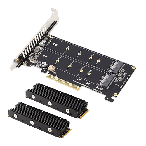 - Zwei Samsung 970 Evo Plus mit je 2 TB, auf einer x8 Erweiterungskarte (x4x4 Bifurcation) samt JEYI Passivkühlkörpern