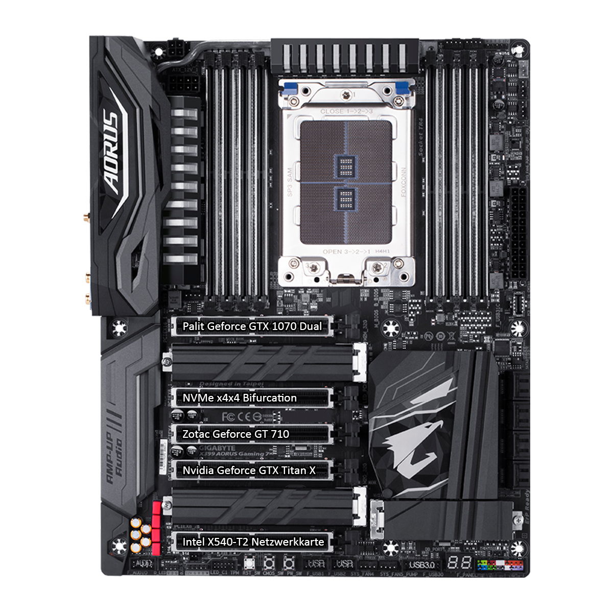 Alle Slots des Mainboards sind belegt, folgende Grafikkarten sind verbaut: