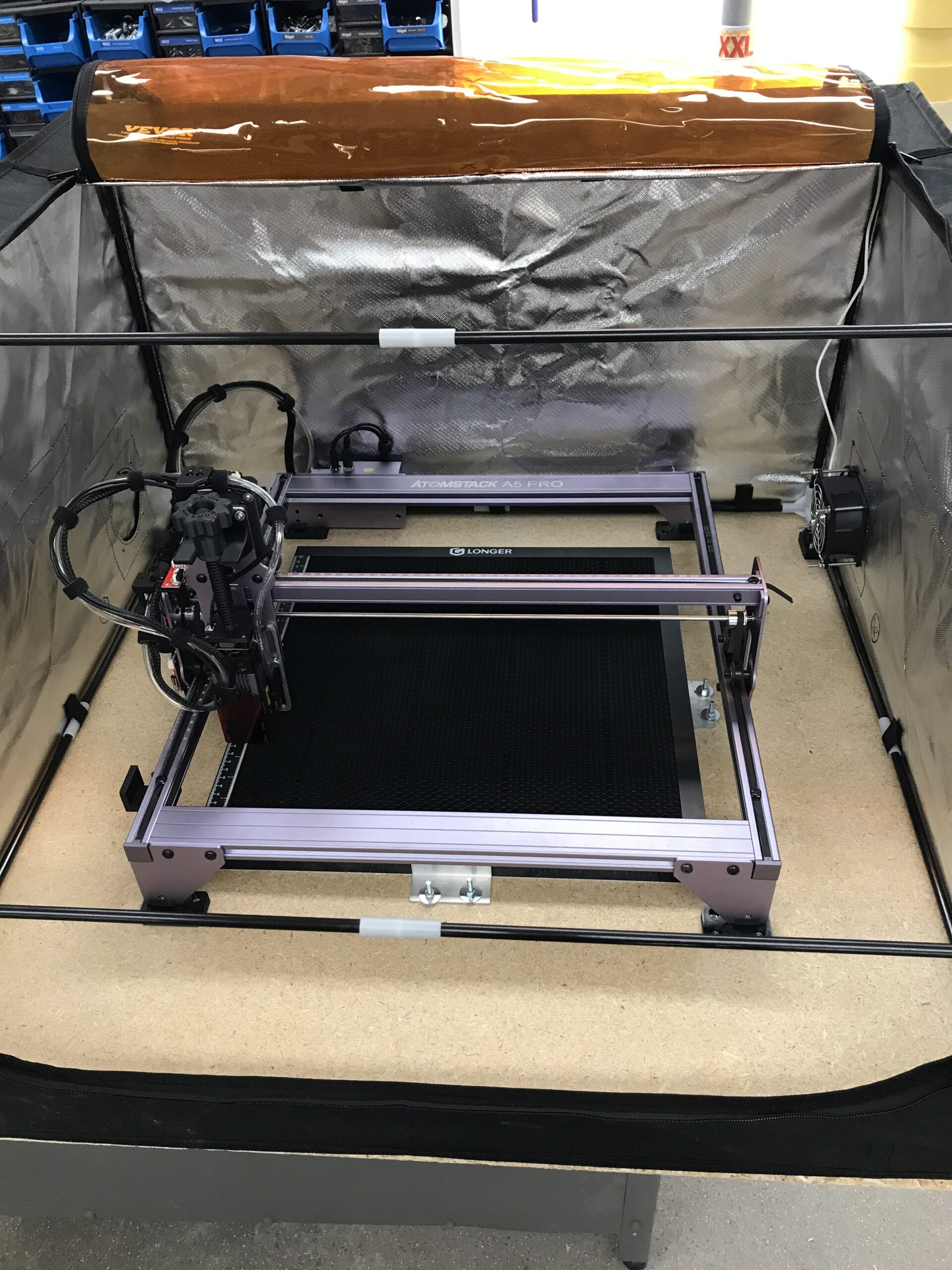 Nachdem die Umhausung samt Basis aus OSB-verstärkter Pressspanplatte vernünftig verbaut war ist mir aufgefallen das die Schleppketten überhaupt kein Platz zum Ausrollen gehabt hätten. Statt diesen habe ich die Kabelführung nun mit Klettkabelbindern umgesetzt. Das funktioniert gut, nichts schleift oder hängt durch. Mittlerweile wurden auch schon einige Dinge gelasert.