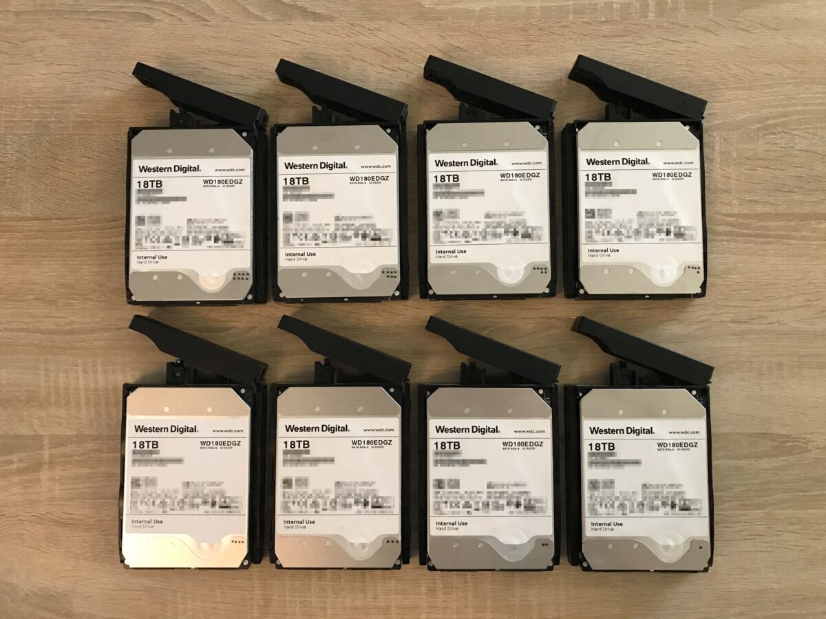 Seither wurde der RAM von der Werkskonfiguration von einem 4 GB DDR4-2133 Riegel auf 2 x 8 GB DDR4-2133* für insgesamt 16 GB Arbeitsspeicher und Dual-Channel Betrieb aufgerüstet und die Datenträgerkonfiguration mehrfach geändert. Im Moment sind acht 18 TB Laufwerke von Western Digital* verbaut, die ursprünglich aus externen 3.5″ WD Elements* Festplatten stammten.