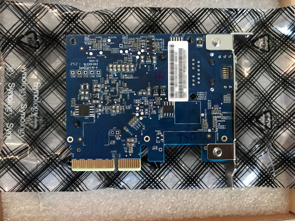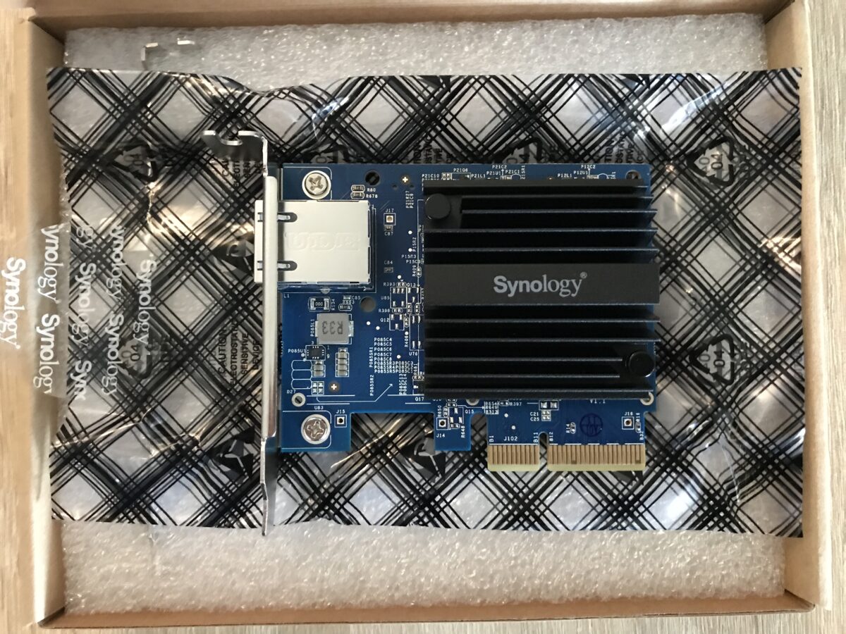 Bis mir vor wenigen Tagen am unteren Ende der „Mindstars“ von Mindfactory die „E10G18-T1*“ Netzwerkkarte von Synology als Einzelstück für 99 € inkl. Versand ins Auge fiel (Testbericht in Englisch). Da ich seit längerem auch noch einen 50€ Gutschein für Mindfactory zur Verfügung hatte war klar: 99 € für eine garantiert immer kompatible Netzwerkkarte ohne Basteln oder Probleme ist kein schlechtes Angebot, der wenig schwankende Normalpreis für dieses Modell bewegt sich seit es auf den Markt kam um die 150 €. Das ich am Ende dann dafür stattdessen 49 € bezahlt habe machte die Aktion noch unausweichlicher für mich. Also los gehts, Karte gekauft.