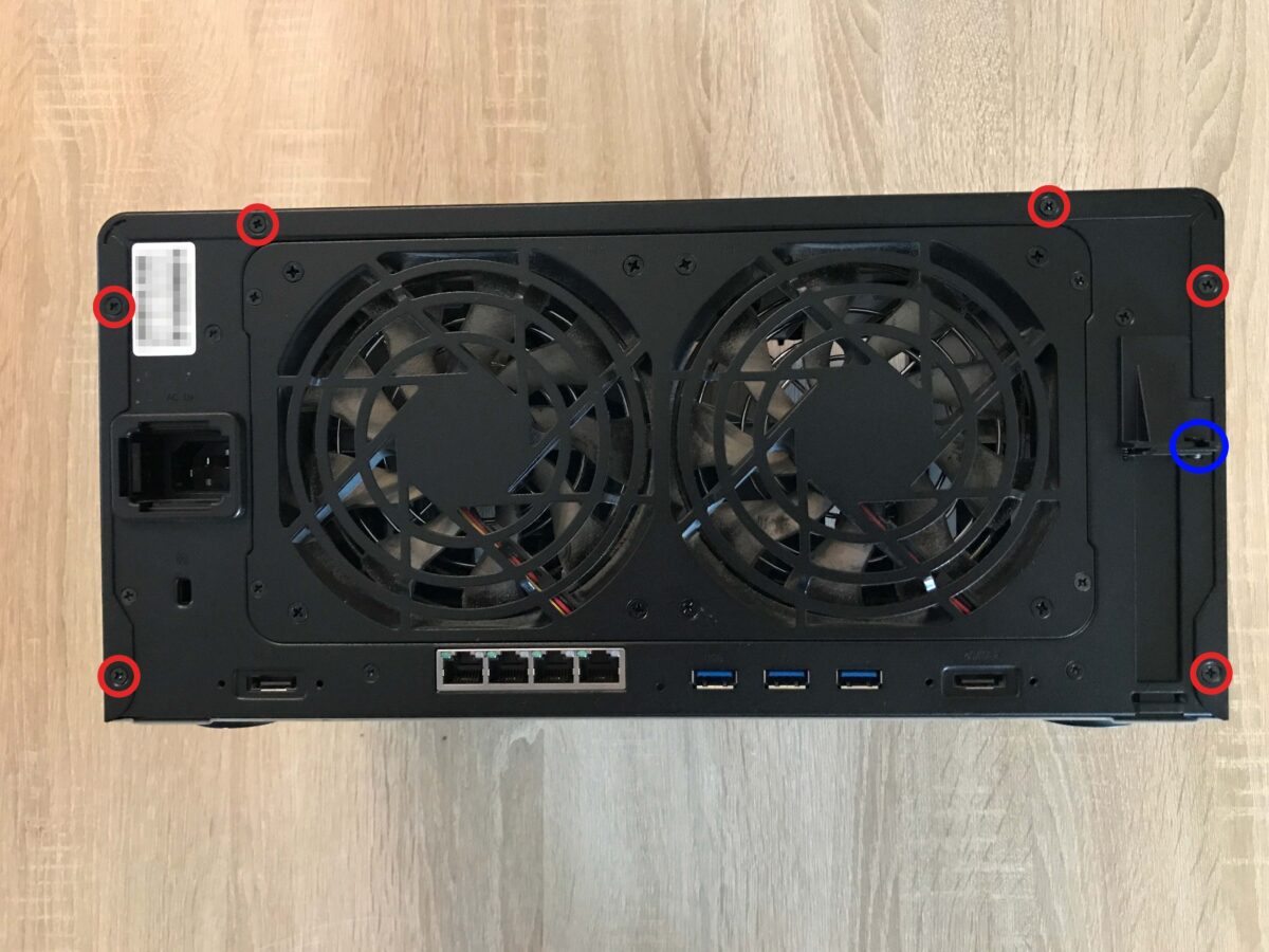Um an den PCIe-Slot zu gelangen muss das Blechgehäuse entfernt werden. Dazu müssen alle rot umkreisten PH2-Kreuzschlitzschrauben entfernt werden, anschließend kann das Blechgehäuse durch schieben in Richtung Rückseite ausgehängt und vorsichtig abgenommen werden. Die blau umkreiste Kreuzschlitzschraube dient zur Befestigung der Karte / des Slotblechs: