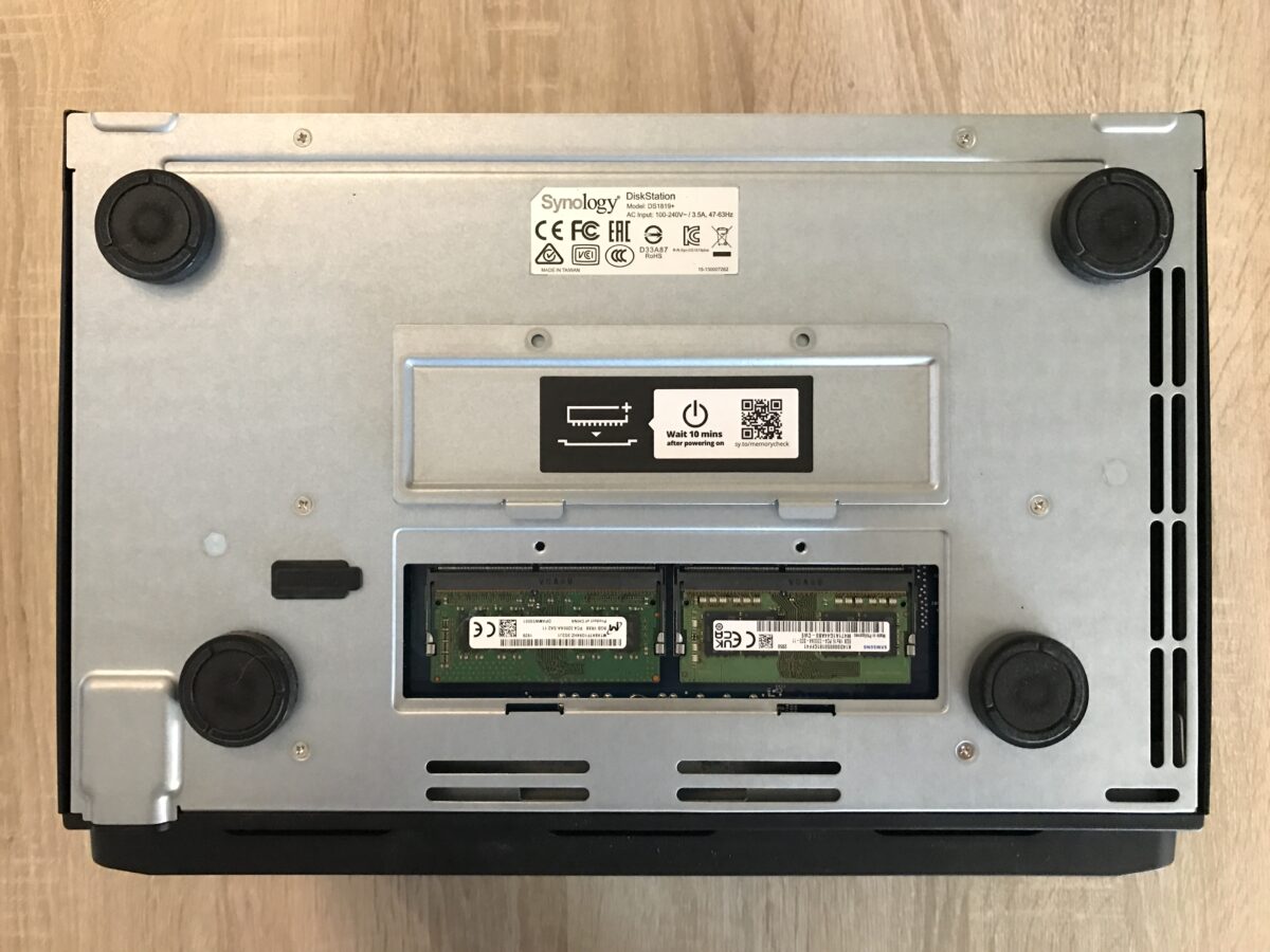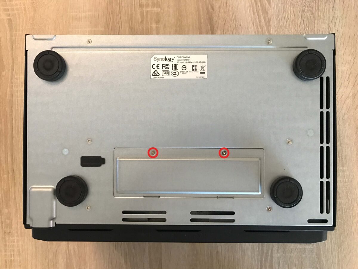 Um an den Arbeitsspeicher (in meinem Fall zur Reinigung) zu gelangen, muss das DS1819+ umgedreht werden. Im Anschluss müssen zwei PH2-Kreuzschlitzschrauben entfernt werden um den Schacht öffnen zu können: