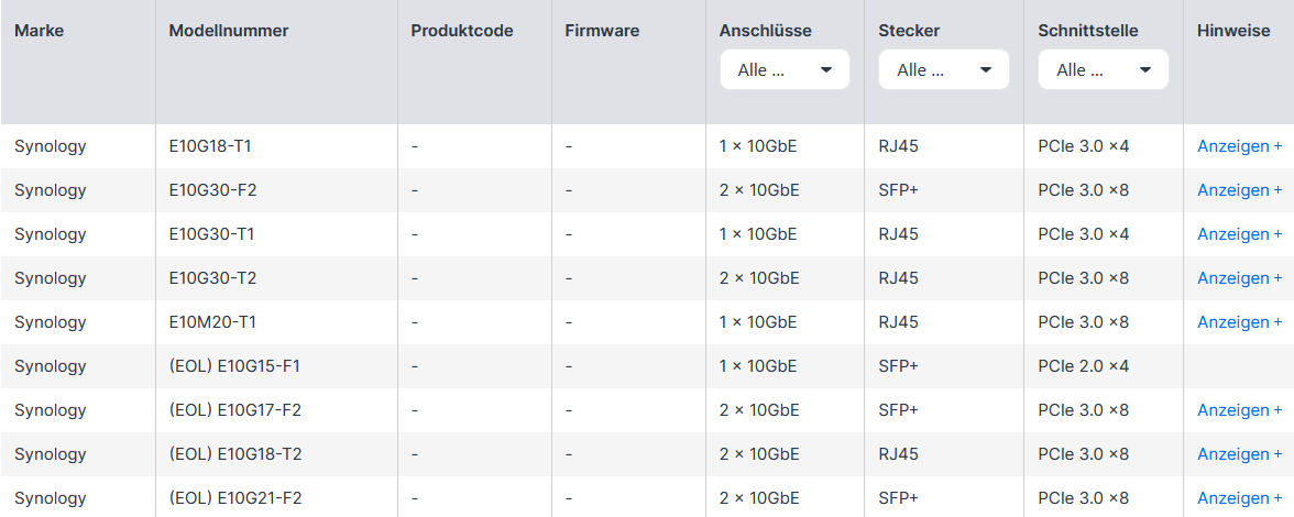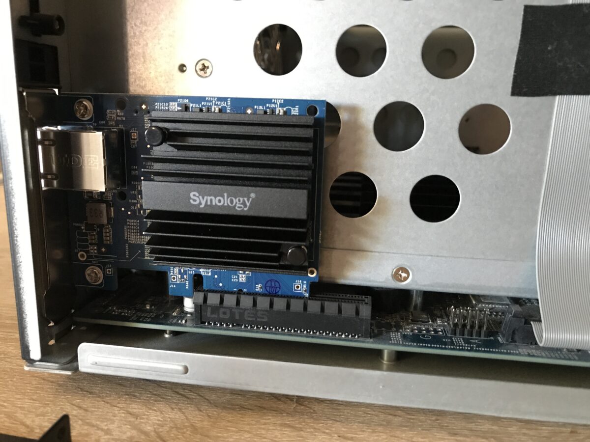 Eigentlich war gedacht, eine der lauffähigen Intel-Netzwerkkarten als Alternative zu den sehr überteuerten Synology-rebrandeten Karten zu verwenden, da diese günstig und in Fülle gebraucht erhältlich sind. Typische Kandidaten mit 10 Gbit über RJ45 (Kupfer) wären die X540-T2* mit zwei bzw. X540-T1* mit nur einem Port oder die deutlich bessere aber auch teurere X550-T2* bzw. X550-T1*. Beide haben das bekannte Problem, warm bis heiß zu laufen. Bei der X540 sind Instabilitäten und Abbrüche ohne aktive Kühlung keine Seltenheit, zumal diese auch nur 10, 100, 1.000 oder 10.000 Mbit unterstützt, 2.500 und 5.000 Mbit fehlen. Dafür ist der Chip zu alt (Diese Zwischenschritte wurden erst später eingeführt).