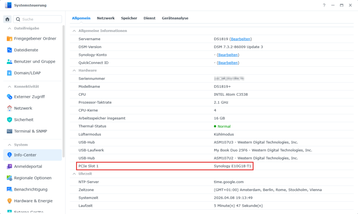 Unser größtes Synology-NAS, ein DS1819+, ist mit einem PCIe 3.0 x8 Erweiterungsslot (elektrisch mit vier Lanes angebunden) ausgestattet was damals neben acht 3.5″ Festplattenschächten einer der Gründe war dieses spezifische Modell anzuschaffen. Gekauft wurde unser Exemplar direkt nach dem Release – Mitte 2019. Auch schon fast 7 Jahre her.
