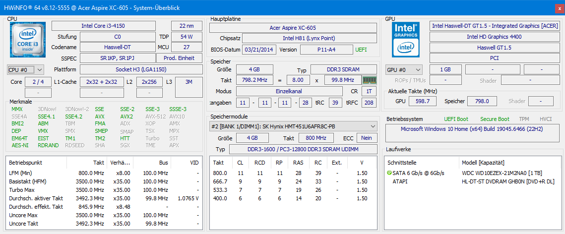 Seit längerem ohne jegliche Updates (End of Life war am 10. Januar 2023!), war das Problem letzendlich abgelaufene Root-Zertifikate. Ein weiterer Betrieb mit 8.1 war sowieso keine praktikable Option, also habe ich ein In-Place-Upgrade auf Windows 10 22H2 via AnyDesk aus der Ferne durchgeführt. Das hat Stunden gedauert, weil als Bootlaufwerk immernoch die werksseitige 3.5″ WD Festplatte mit 1 TB Kapazität* verbaut ist. Der sowieso sehr kleine i3 Zweikerner vierter Generation wird zusätzlich durch die mittlerweile sehr schmalen 4 GB DDR3 RAM in Form eines Speicherriegels zusätzlich stark ausgebremst. Alles in allem ein deutlich gealtertes System, aber mit dem Potenzial sehr kosteneffizient aufgerüstet zu werden. Genau das habe ich dann heute, einige Tage später, auch getan.