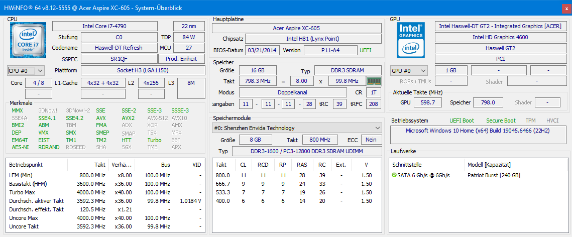 Der PC wird lediglich zum Betrachten von Fotos und gelegentlichem Surfen im Internet verwendet. Also kein Grund, auf allerneueste und teure Hardware umzusteigen. Für überschaubares Geld lässt sich noch einiges aus diesem 2014er Acer Aspire herausholen – Hier eine Gegenüberstellung der aktuellen Komponenten und der geplanten Aufrüstung: