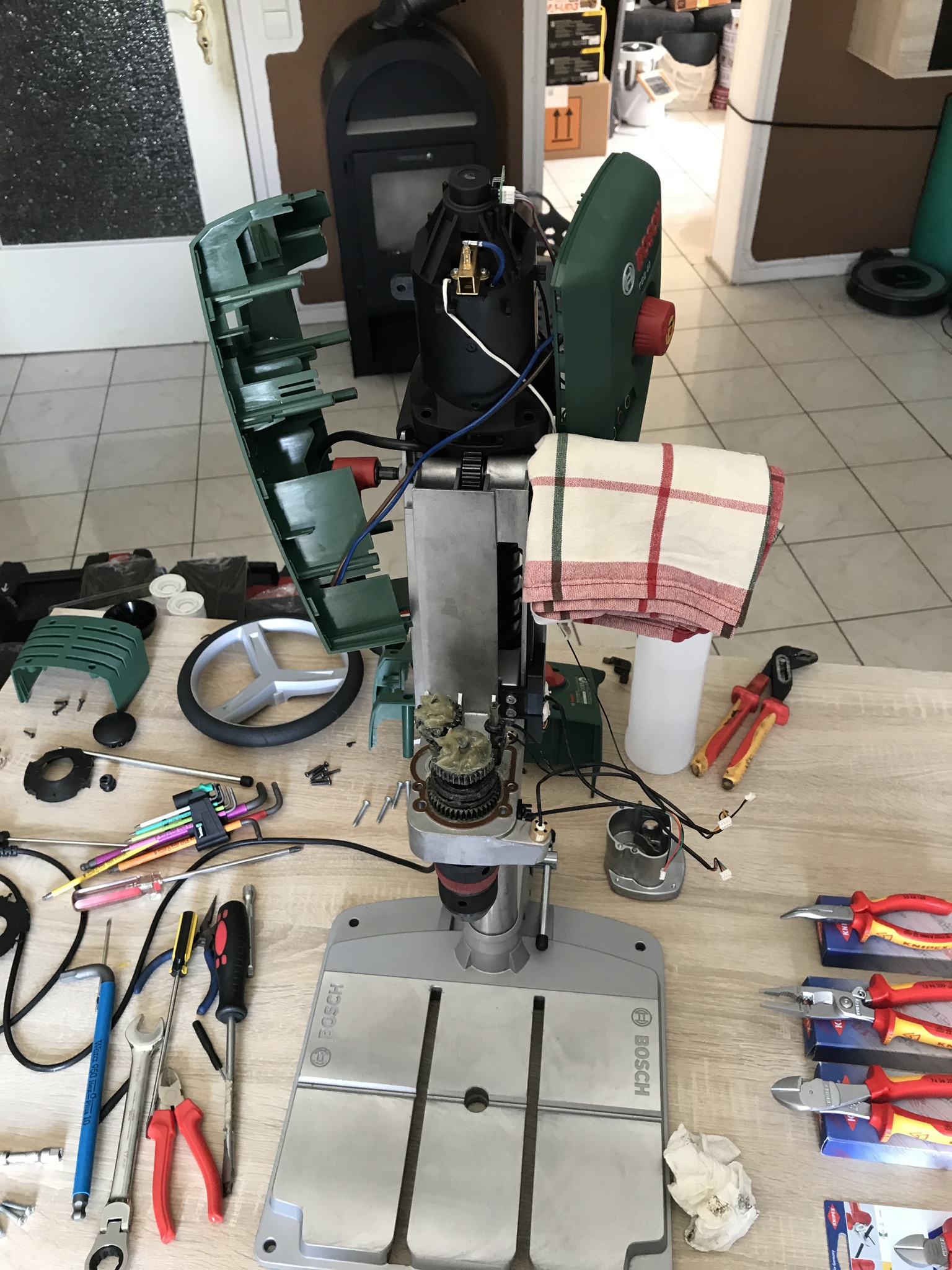 That’s why buying second-hand made sense; I didn’t want to be restricted in my actions by a warranty period and preferred to invest the money I saved on the purchase in the conversion. Alternative bench drills, e.g., from Scheppach* or Parkside, don’t really offer much more, and I can’t imagine that they are any more accurate. That’s why I opted for Bosch, even if it’s “only” Bosch Green (for private use, not commercial).
