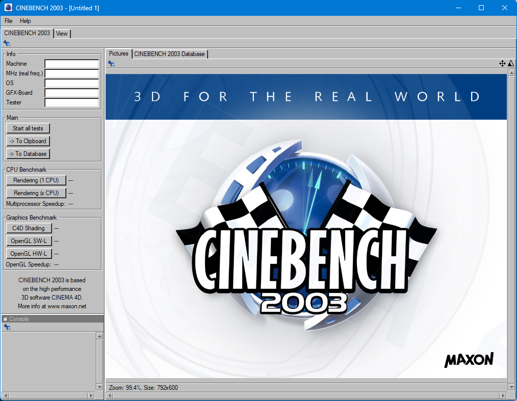 CINEBENCH 2003January 1st, 2003x86 (32-Bit)Yes (OpenGL)Windows 98 SE / 2000 / XP or newer